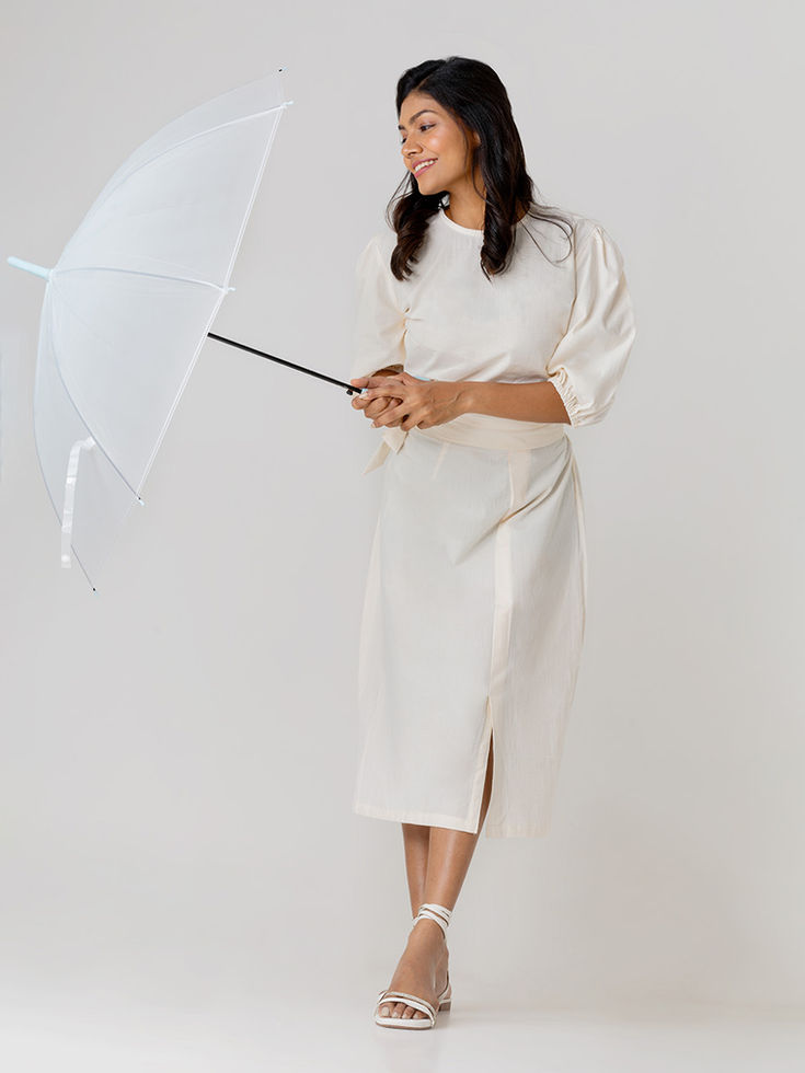 Suzume brings a fresh take to classic houndstooth with a coordinated set designed for stylish everyday comfort in India, combining a slim-strap crop top with adjustable side ties that create a soft scalloped shape and a fully lined A-line skirt with rounded hems and knee-high slits for graceful movement. The elasticated back ensures a flexible fit through long commutes and active routines, while the back slit on the top keeps getting dressed quick and easy. Perfect for women exploring trending co-ord sets and online shopping for women, this look transitions effortlessly from office hours to dinner plans — delivering confidence, comfort and a polished modern profile in one go.