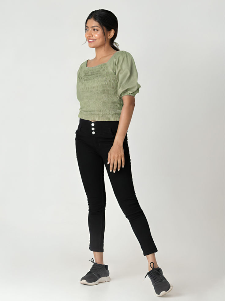 Junko brings a joyful fit with a smocked body that adapts easily to movement and shape. The square neckline frames beautifully, while the puff sleeves introduce soft volume — ideal for Indian weather. A colourful option for women searching Womens tops Online – Trending collections while enjoying Online Shopping for Women in India.
